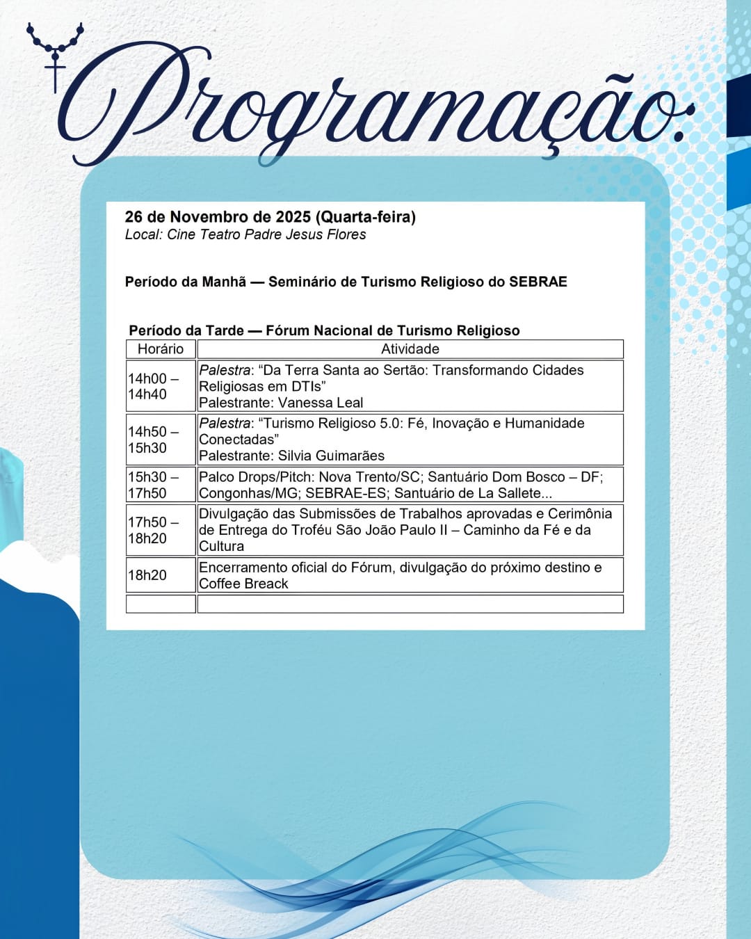 Prepare-se para o encontro que vai redefinir o futuro do turismo religioso no Brasil! O 7º Fórum Nacional de Turismo Religioso é a sua porta de entrada para um universo de conhecimento, inspiração e conexões transformadoras.