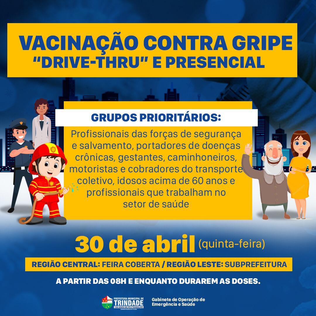 A Prefeitura de Trindade, por meio da Secretaria Municipal de Saúde, informa que o retorno da campanha de vacinação contra gripe será nesta quinta-feira (30/04), em dois pontos estratégicos do município.