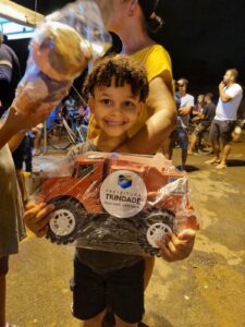 Representando a OVG, a gerente de Promoção do Voluntariado da instituição, Larissa Guimarães, lembrou que a parceria ajudou a entregar carrinhos, bolas de vôlei e futebol e bonecas. “Estamos nesta festa maravilhosa, em Trindade, com brinquedos de excelência em qualidade”, enfatizou.