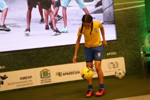 Chamou a atenção a menina Júlia Beatriz (foto abaixo), que nas palavras dos presentes, “bate um bolão”, fazendo dezenas de embaixadinhas sem deixar a bola cair. Ela se apresentou no palco como forma de representar o grande interesse de mulheres inscritas.