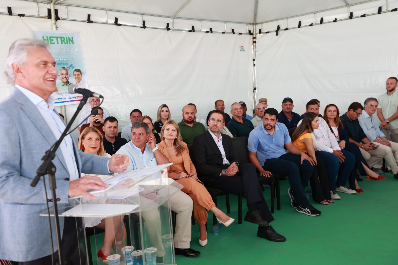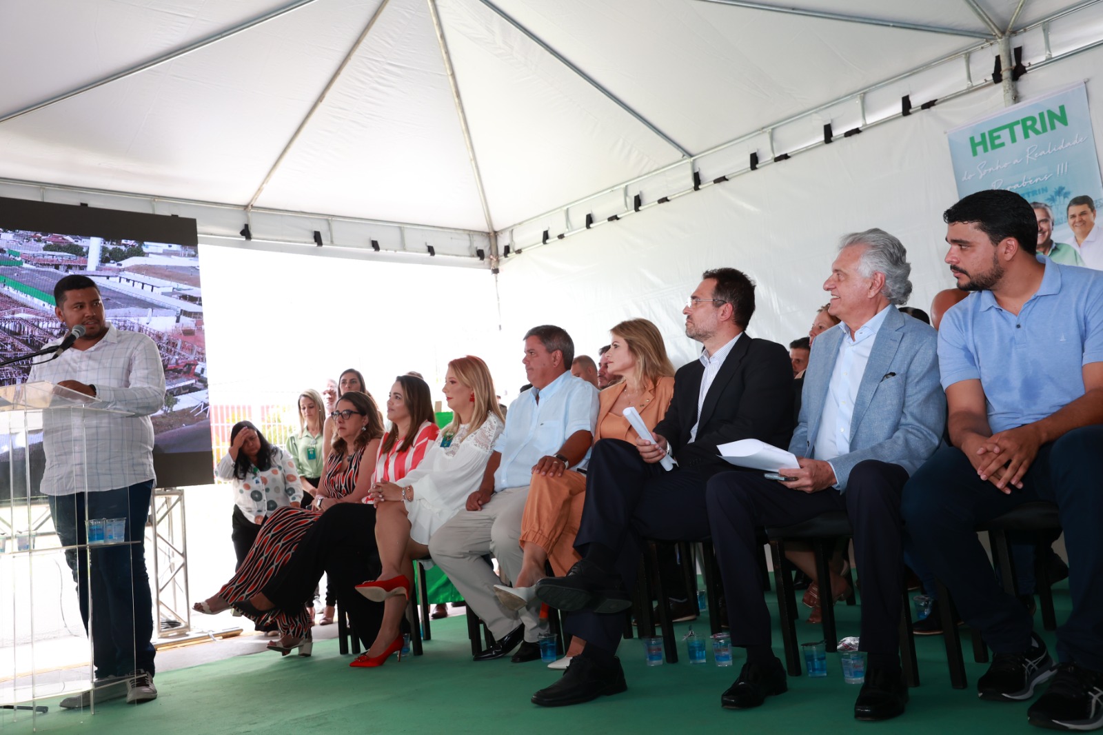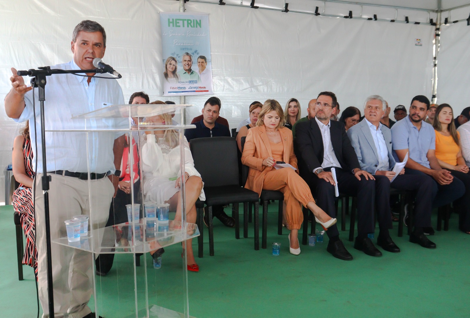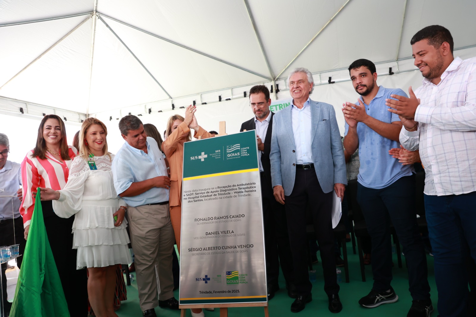 Ronaldo Caiado fez um cumprimento especial às forças políticas de Trindade presentes no evento, citando, além de Marden, seus familiares, os deputados Flávia e George Morais, o deputado estadual Cristiano Galindo e o ex-prefeito Jânio Darrot.