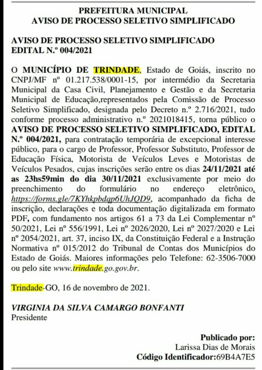 Será publicado pela Prefeitura de Trindade na próxima semana, o Edital do Processo Seletivo Simplificado para cargos na Secretaria Municipal de Educação. O edital é relativo à abertura do processo para contratação temporária, e vai conter os prazos, os cargos, documentos exigidos, número de vagas e vencimentos previstos. Na última quinta-feira (18/11) foi publicado o Aviso 004/2021, que torna pública a realização do concurso.