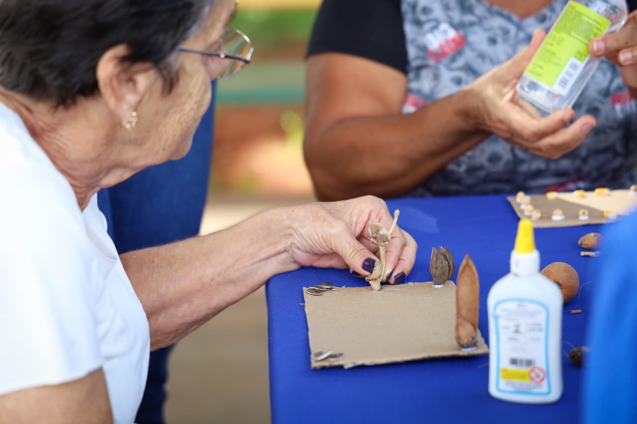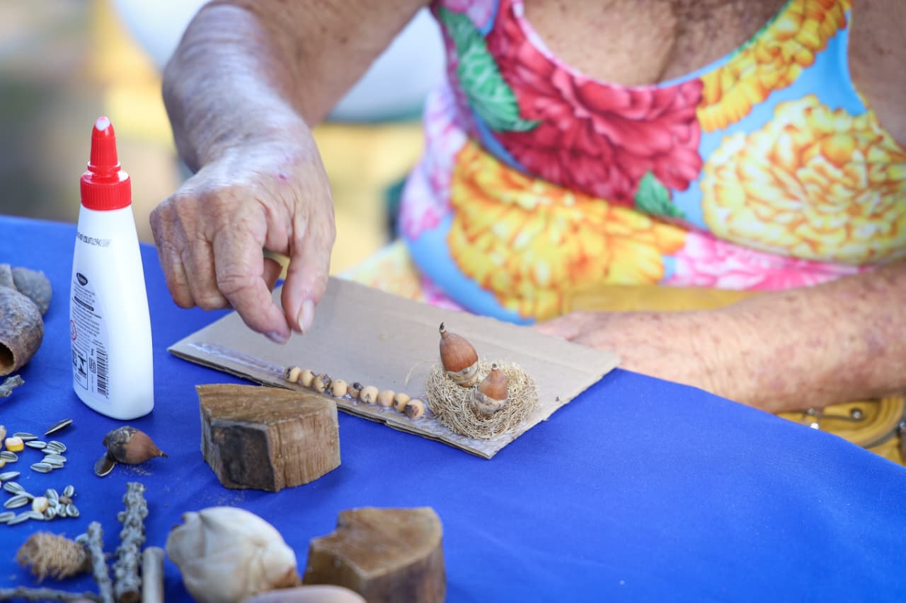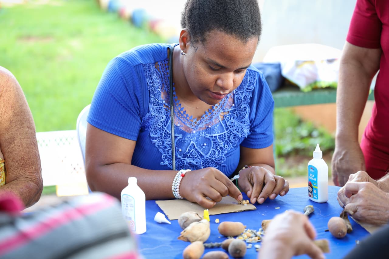 Iniciativa reúne usuárias do CRAS Pai Eterno. Durante atividade, são utilizados materiais como diferentes tipos de sementes, cola e papelão, com criação de peças artesanais e incentivo ao reaproveitamento de recursos simples e acessíveis