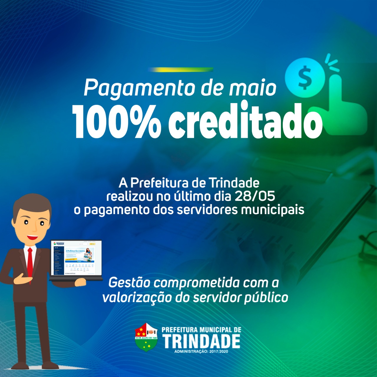 Por determinação do prefeito Jânio Darrot, os servidores municipais de Trindade receberam os vencimentos relativos ao mês de maio nesta terça-feira (28/05). O pagamento foi 100% creditado. A medida faz parte dos esforços empreendidos pela gestão municipal no sentido de, sempre, valorizar os colaboradores. “Os resultados positivos de nossa gestão devem ser compartilhados com todos”, afirma o prefeito Jânio Darrot. Ele destaca que a prestação de serviços de qualidade depende, fundamentalmente, do trabalho realizado pelos servidores. “Cada um se esforça, em suas atribuições, para atender as demandas e contribuir para melhorar a qualidade de vida da população”, conclui.