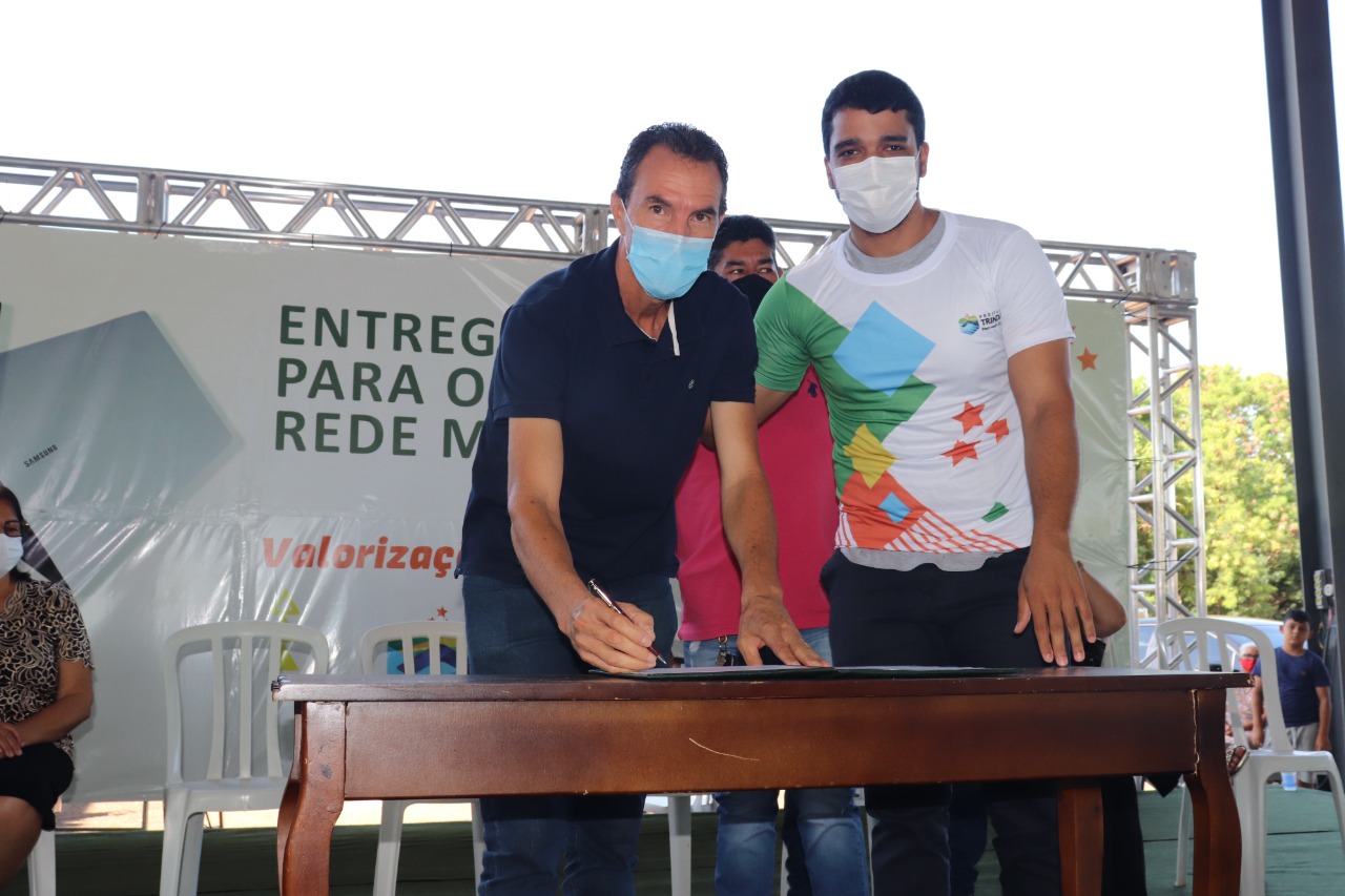 Foi assinado na manhã desta sexta-feira (11/03), projeto de lei concedendo o reajuste de 33,24% para o piso salarial dos professores da rede municipal, seguindo o valor nacionalmente instituído. Ele anunciou o benefício na presença de 800 professores em evento para entrega de notebooks para a rede, equipamentos que exigiram um investimento de mais de R$ 3 milhões.