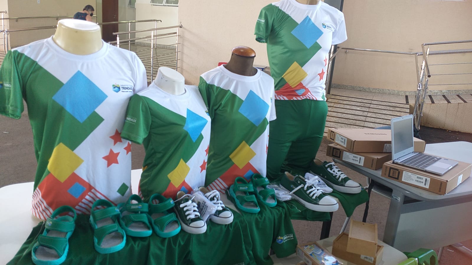 O prefeito até vestiu uma camiseta do novo uniforme para apresentar o desenho aos professores. Tênis, sandálias, estojos, cadernos, muita coisa será entregue aos alunos nos próximos dias.