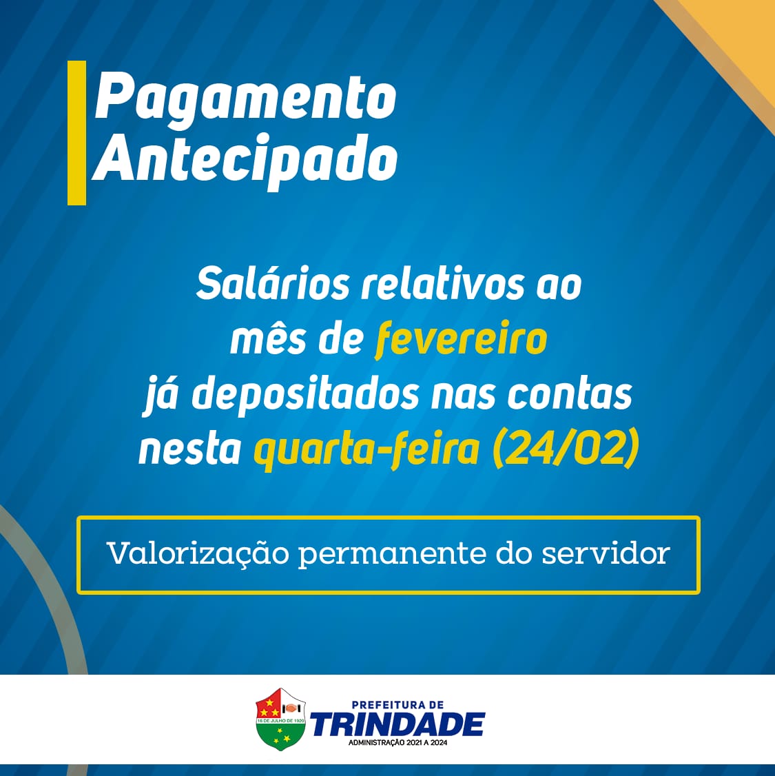 O prefeito de Trindade, Marden Júnior, informa que os salários dos colaboradores municipais relativos ao mês de fevereiro já foram depositados nas respectivas contas nesta quarta-feira (24/02).