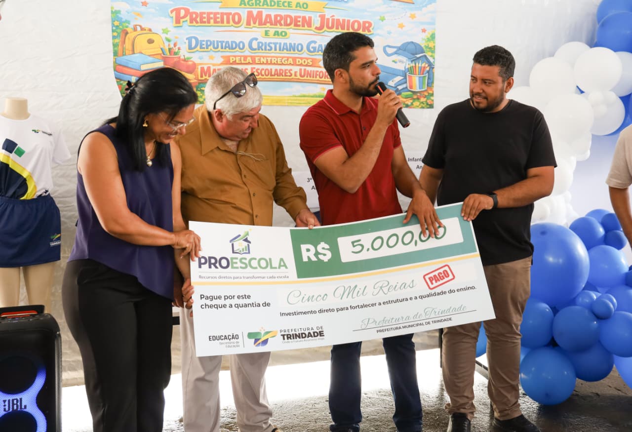 O prefeito Marden Júnior e o deputado estadual Cristiano Galindo encerraram na segunda-feira (02/02) o ciclo de entregas dos kits escolares e uniformes aos alunos da rede municipal de ensino de Trindade. A presença em todas as escolas e Cmeis durante o processo reforça o compromisso com a qualidade da educação pública e com o atendimento direto às famílias.