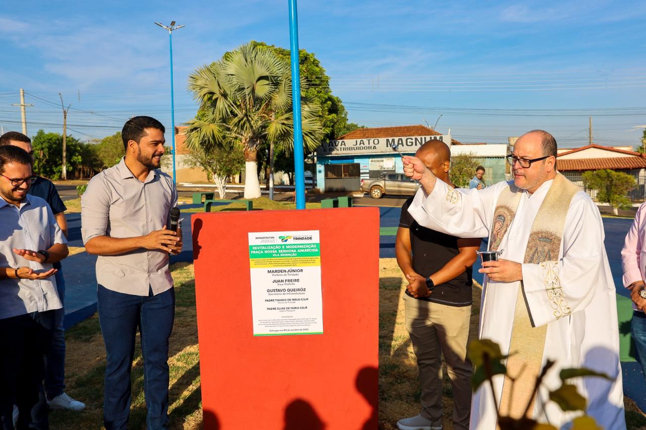 Na manhã desta sexta-feira (03), a Prefeitura de Trindade entregou a revitalização da Praça Nossa Senhora Aparecida, na Vila Redenção, dentro das comemorações dos 50 anos do Jubileu de Ouro da Capela Nossa Senhora Aparecida. O espaço foi totalmente renovado para oferecer conforto, beleza e acessibilidade a quem vive e frequenta a região.