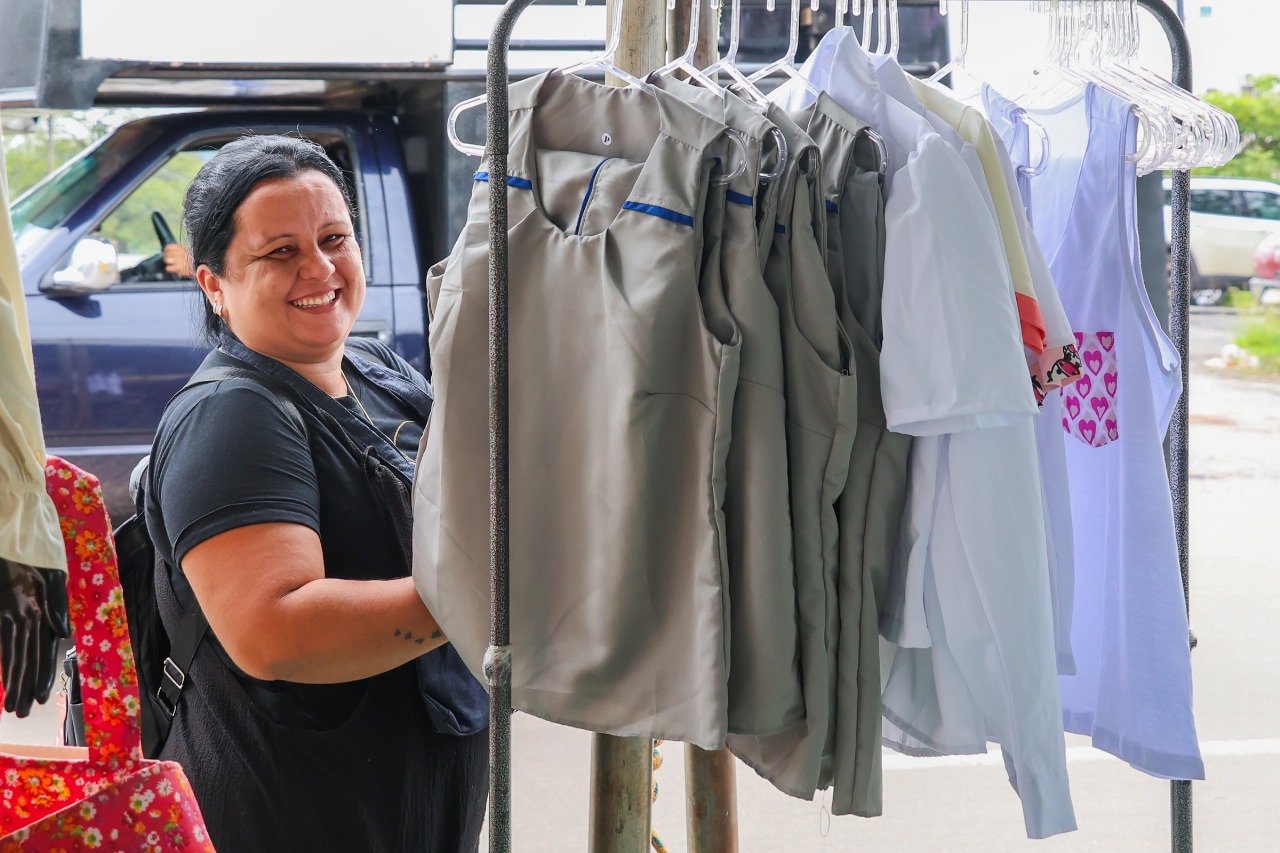 A aluna Rosiléia Nunes, que iniciou o curso de costura há um ano, na APL da Moda, hoje já possuiu sua própria banquinha de roupas no Bairro Santuário, próxima à Basílica do Divino Pai Eterno.