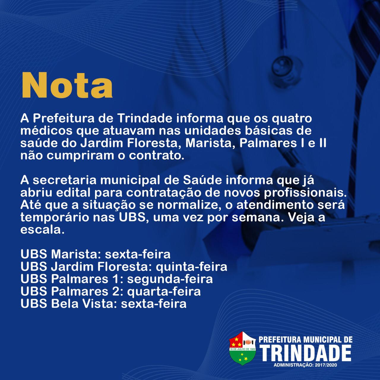 A Prefeitura de Trindade comunica à população que os quatro médicos que atuavam nas unidades básicas de saúde do Jardim Floresta, Marista, Palmares I e II não cumpriram o contrato. A secretaria municipal de Saúde informa que já abriu edital para contratação de novos profissionais. Até que a situação se normalize, o atendimento será temporário nas UBS, uma vez por semana. Veja a escala. UBS Marista: sexta-feira UBS Jardim Floresta: quinta-feira UBS Palmares 1: segunda-feira UBS Palmares 2: quarta-feira UBS Bela Vista: sexta-feira