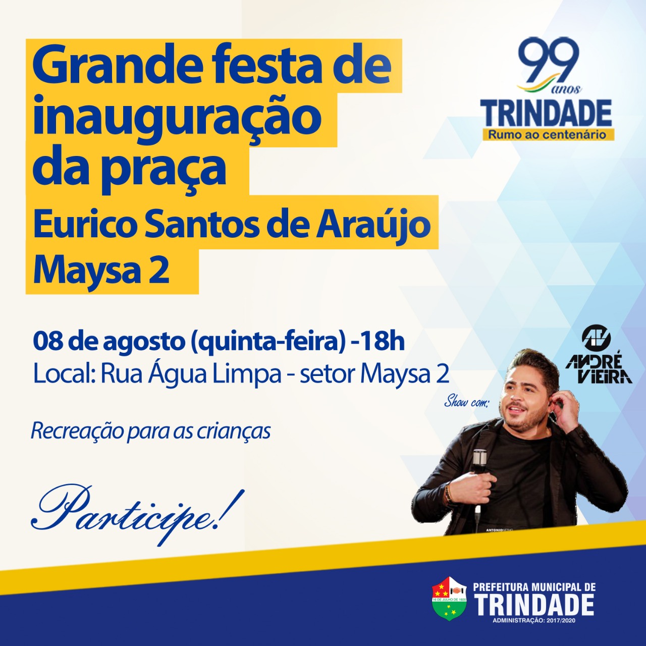 A prefeitura de Trindade inaugura, nesta quinta-feira (08/08), a praça Eurico Santos de Araújo, localizada na rua Água Limpa, setor Maysa 2, região Leste de Trindade. Uma grande festa foi preparada para marcar a data, a partir das 18h, com show do cantor André Vieira, recreação para crianças e muito mais.