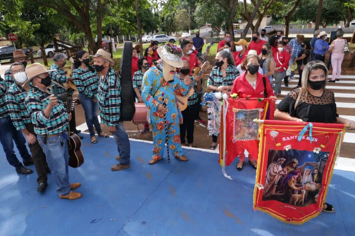 Prefeito Marden Júnior faz entrada da bandeira da folia de reis na capela, ao lado da primeira-dama, Dona Dorinha. Ele destaca que, devido à pandemia de Covid-19, o encontro contou com a presença de apenas quatro grupos de foliões e reafirmou a importância de seguir as medidas de prevenção, com uso de máscara facial, álcool 70% e aferição de temperatura. “Estamos muito felizes em receber esses grupos, que celebram conosco. Isso é cultura e valorização dos que mantêm essa tradição viva”, ressalta