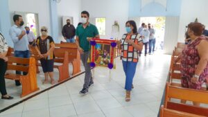 O prefeito Marden Júnior fez a entrada da bandeira da folia de reis na capela, ao lado da primeira-dama, Dona Dorinha.