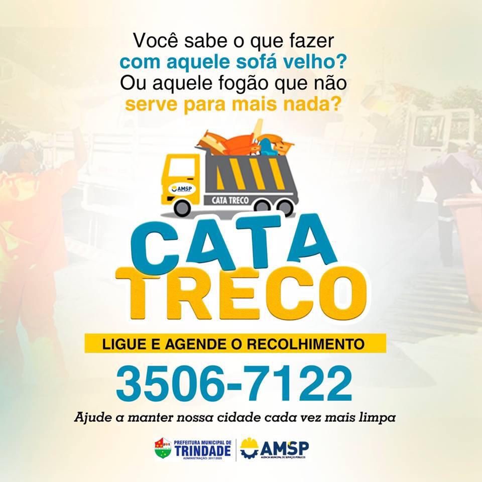 A prefeitura de Trindade, por meio da Agência Municipal de Serviços Públicos (AMSP), presidida pelo Léucio Rodrigues, o Ceguinho, promove, na região Central, atividades do Cata-treco com recolhimento de materiais como galhos de árvores, armários, sofás e móveis em geral. “Trabalhamos em prol da população e vamos atender às solicitações para deixar a cidade cada vez mais limpa e bonita”, afirma Léucio Rodrigues. O serviço pode ser solicitado pelo telefone (62) 3506-7122.