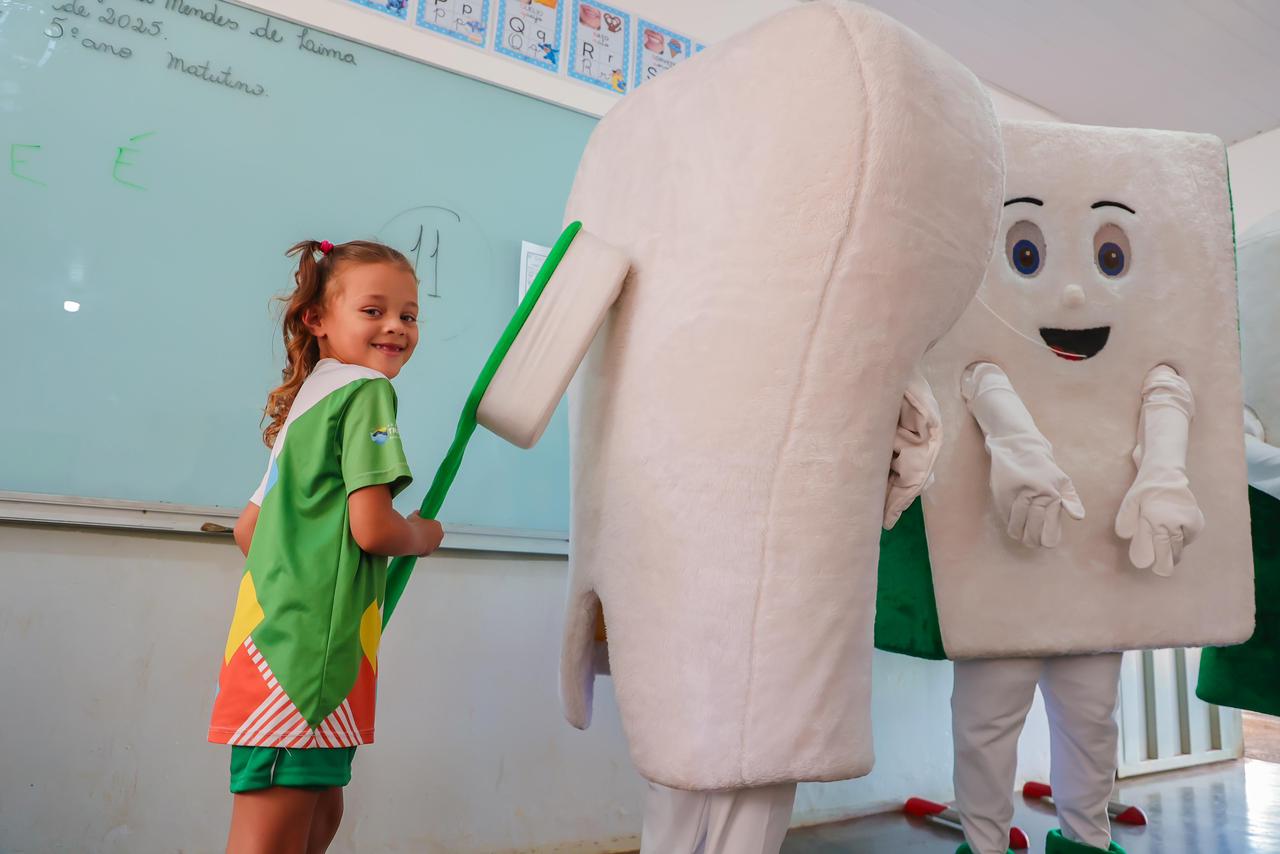 Alunos da Escola Municipal Professora Gleide Mendes receberam palestra, kits de higiene e aprenderam de forma lúdica com personagens sobre a importância da escovação