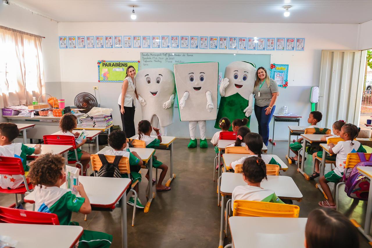 Alunos da Escola Municipal Professora Gleide Mendes receberam palestra, kits de higiene e aprenderam de forma lúdica com personagens sobre a importância da escovação
