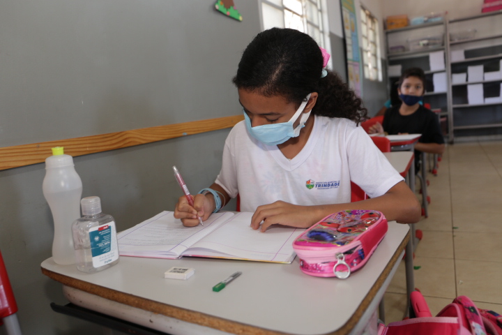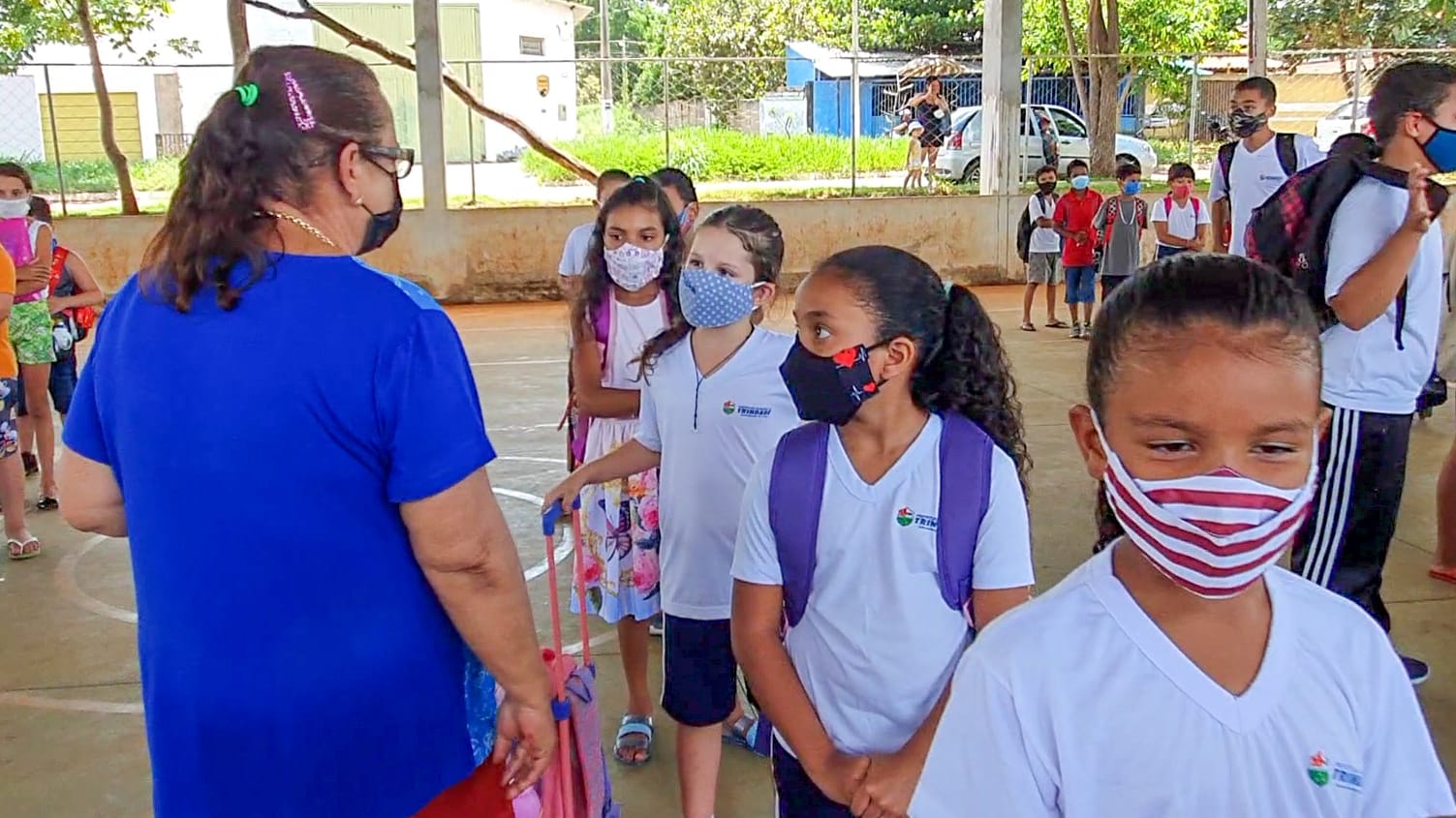 Prefeito Marden Júnior e secretário municipal de Educação de Trindade, Sérgio Sanches, deram boas-vindas a crianças de algumas unidades e anunciaram entrega de kits de material escolar, uniforme e mochilas no fim de fevereiro. Turmas estão se revezando para garantir presença de apenas 50% dentro das salas. Todas as crianças usam máscara facial e têm temperatura aferida. Separação entre mesas e carteiras escolares garante distanciamento social
