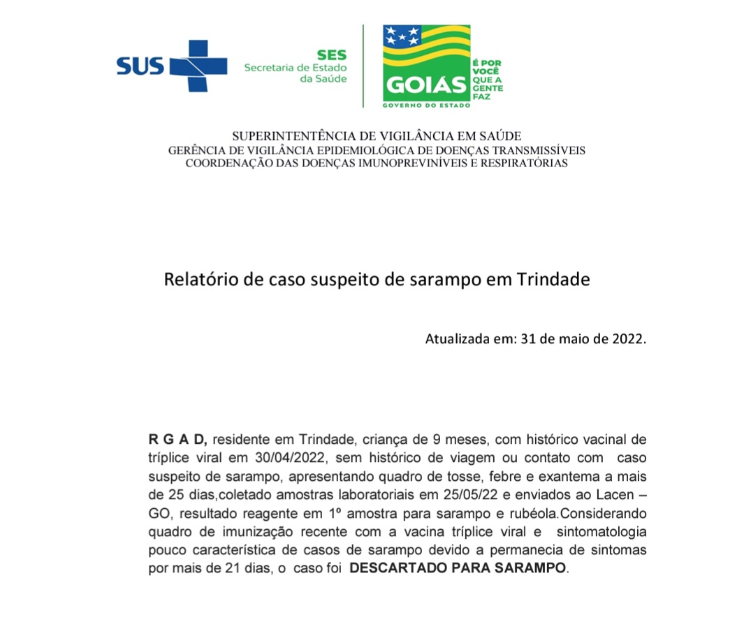 O resultado veio em relatório da Superintendência de Vigilância em Saúde, Gerência de Vigilância Epidemiológico de Doenças Transmissíveis e da Coordenação das Doenças Imunopreviníveis e Respiratórias da Secretaria Estadual de Saúde. O resultado foi negativo também para rubéola.
