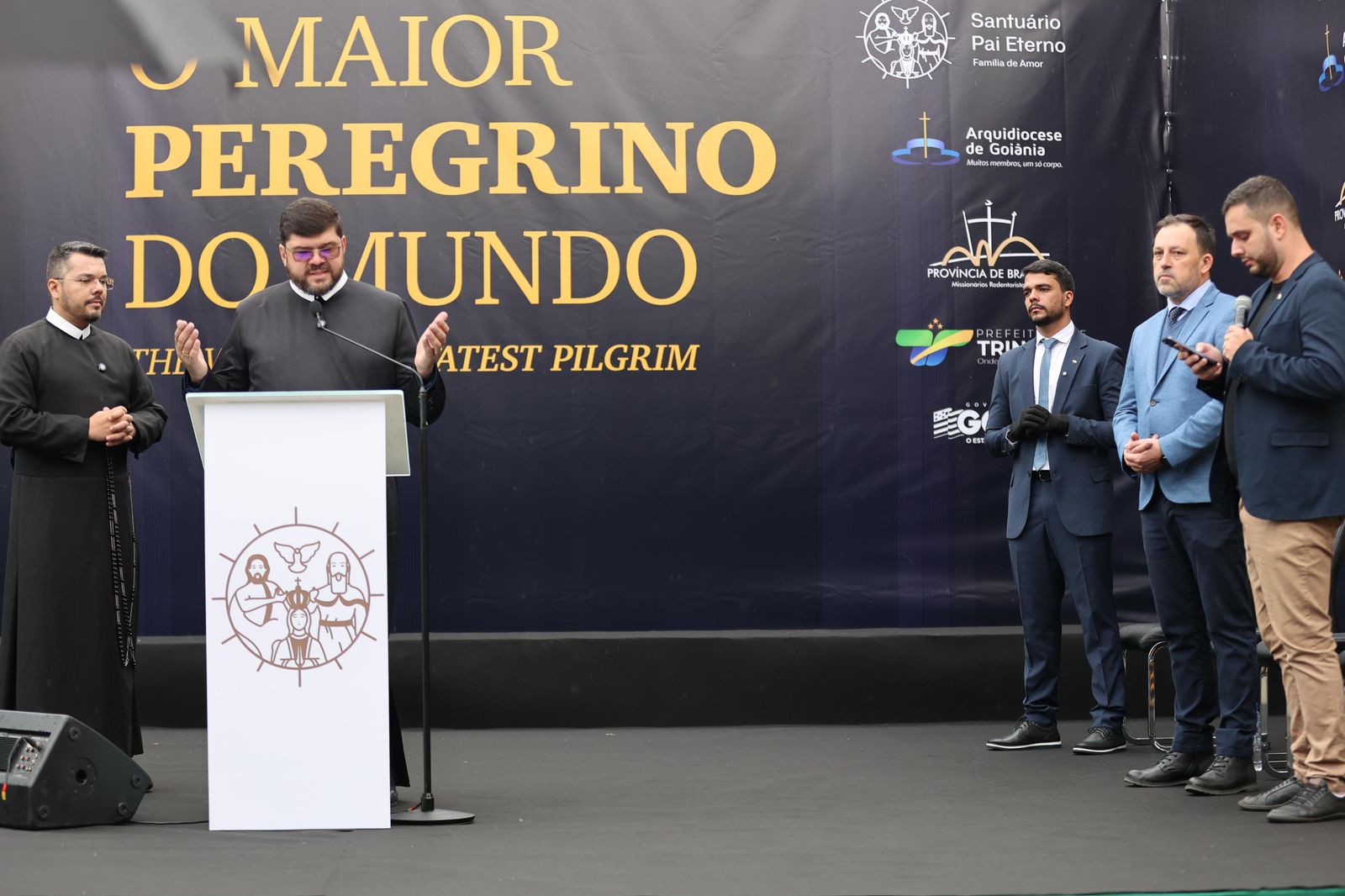 Cerimônia contou com bênção religiosa e presença do prefeito Marden; peça monumental visitará três cidades brasileiras antes de chegar a Goiás