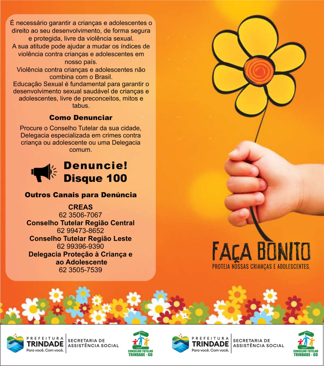 Estão agendados nove eventos em Trindade dentro da Campanha de Combate ao Abuso e à Exploração Sexual contra Crianças e Adolescentes. Início foi nesta quarta-feira (11/05) e última atividade será no dia 21, no Parque Lara Guimarães. Secretaria Municipal de Assistência Social da Prefeitura de Trindade preparou eventos de orientação e conscientização sobre o que é abuso sexual e o que é exploração sexual de crianças e adolescentes, e onde denunciar os casos em Trindade