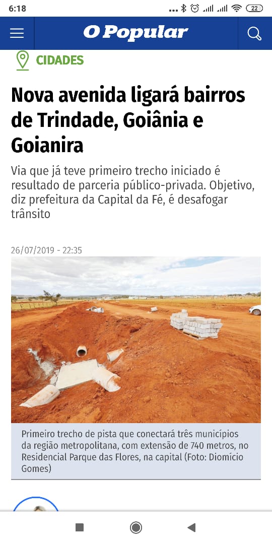 As ações do prefeito Jânio Darrot são destaque na edição deste sábado de O Popular. O jornal informa que os municípios de Trindade, Goiânia e Goianira serão interligados por meio de uma nova avenida. As obras tiveram início no mês de junho deste ano e fazem parte de um projeto da prefeitura em parceria com a iniciativa privada. Ao todo, serão 7,6 quilômetros de extensão. De acordo com a repórter Jéssica Torres, a pista começa no km 7 da GO-070, em Goiânia (saída para Goianira), região limítrofe com Trindade. Segue sentido Capital da Fé, no rumo Oeste até encontrar a GO-469, próximo ao Centro do município. A via vai encurtar a ligação também para os residentes em Goianira que vão a Trindade, uma vez que as outras alternativas têm caminhos triangulares, portanto, mais longos. O primeiro trecho da via a ser executado, com extensão de 740 metros, já teve as obras iniciadas, no residencial Parque das Flores, na capital. A avenida, que ainda não tem nome definido, será de mão dupla. O secretário de Planejamento Urbano, Habitação e Regularização Fundiária de Trindade, Marden Júnior, explica que a iniciativa visa criar uma ligação mais curta para o deslocamento da população que fica localizada na região Noroeste de Goiânia e Goianira, municípios limítrofes. A região abriga, de acordo com o Conselho de Desenvolvimento Econômico, Sustentável e Estratégico (Codese) de Goiânia, 80 bairros. Neles, segundo dados do Instituto Brasileiro de Geografia e Estatística (IBGE), residem 350 mil pessoas.