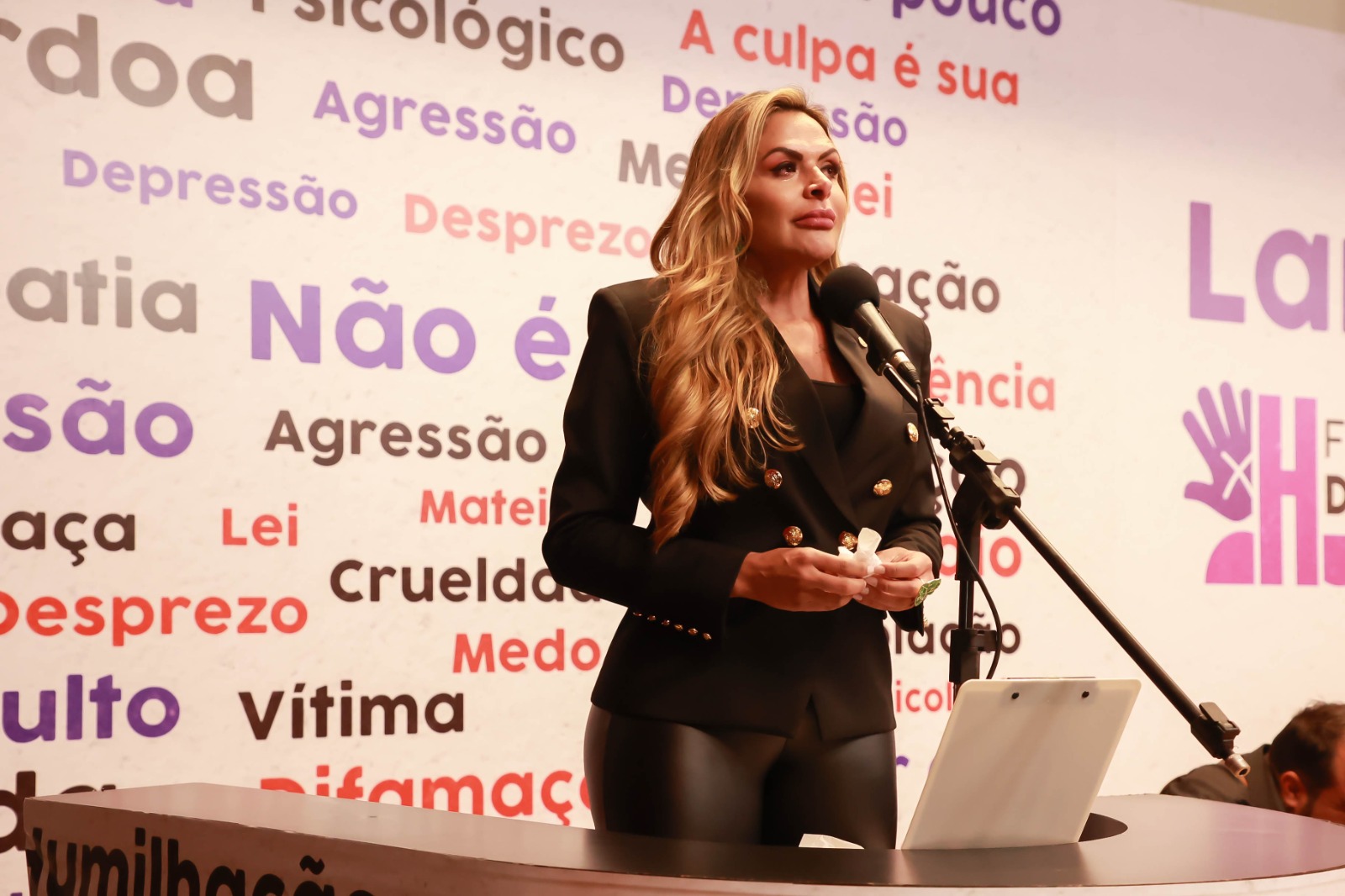 Primeira-dama do município, Dona Dorinha lidera comitiva em ação organizada pela deputada federal Silvye Alves, no Palácio do Congresso Nacional, na Câmara Federal, nesta terça-feira (09/05). Iniciativa conta com participação de 17 senadores e 207 deputados. Meta é que Judiciário, Ministério Público, polícias Civil e Militar tenham maior celeridade nos processos relativos às agressões