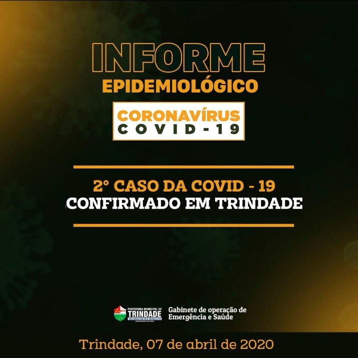 Trindade registrou, na manhã desta terça-feira (07/04), o segundo caso confirmado de Covid-19 no município, informa a Prefeitura Municipal, por meio do Gabinete de Operação de Emergência e Saúde. A paciente é uma mulher jovem, que estava no exterior, e que se encontra em isolamento domiciliar. Ela não apresenta mais sintomas gripais e nenhum dos familiares teve manifestações da doença.