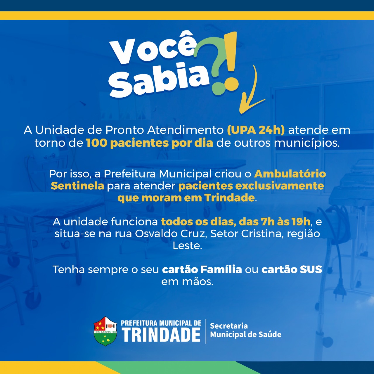 A Unidade de Pronto Atendimento (UPA 24h) atende em torno de 100 pacientes por dia de outros municípios. Por isso, a Prefeitura Municipal criou o Ambulatório Sentinela para atender pacientes exclusivamente que moram em Trindade.