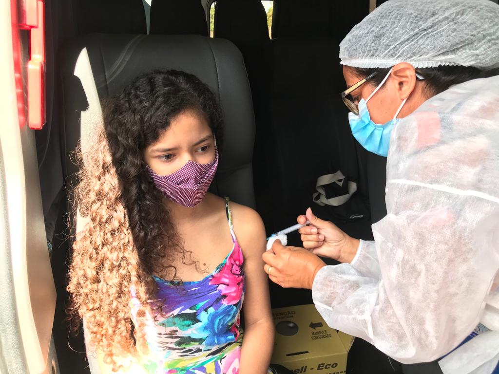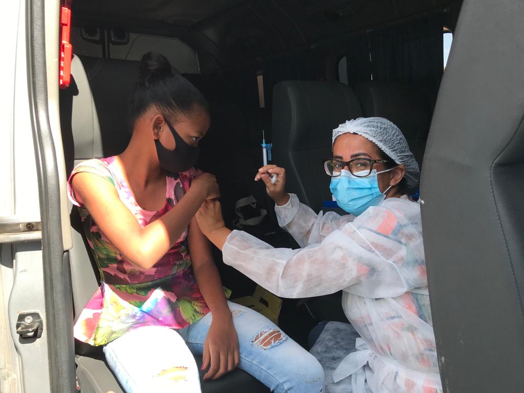 Moradora no Setor Pontakayana, a garota Kêmile Mendes, de 11 anos, aproveitou o Vacimóvel e tomou a primeira dose da vacina nesta segunda-feira.