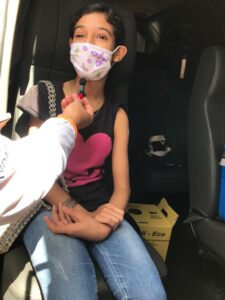 Moradora no Setor Pontakayana, a garota Kêmile Mendes, de 11 anos, aproveitou o Vacimóvel e tomou a primeira dose da vacina nesta segunda-feira.