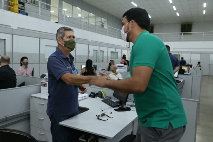Prefeito Marden Júnior e secretário da Fazenda, Josimar da Mota, deram boas-vindas aos servidores no início das atividades do Vapt Vupt e da Arrecadação Municipal no novo endereço. Previsão é que atendimento seja agilizado tanto porque todos os serviços agora podem ser solicitados online (inclusive no WhatsApp 3506-7041), quanto porque agora os dois órgãos estão próximos de outras secretarias que têm interligação com assuntos tratados neles
