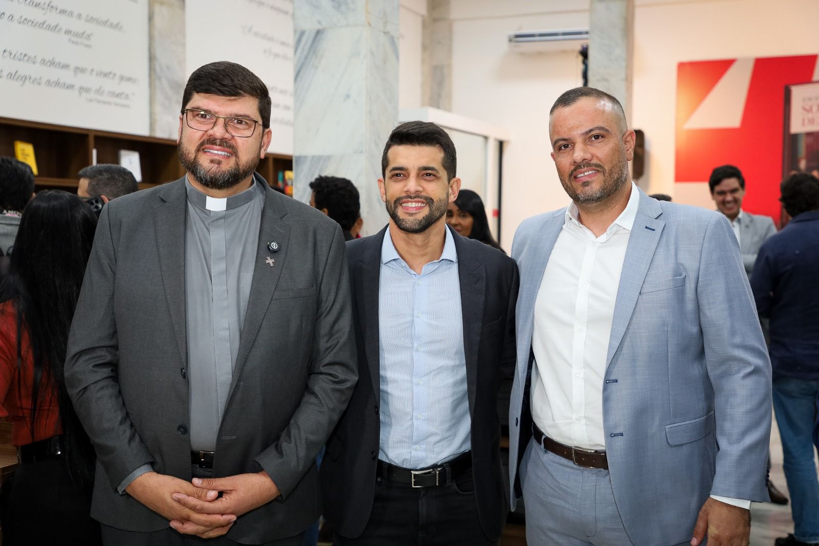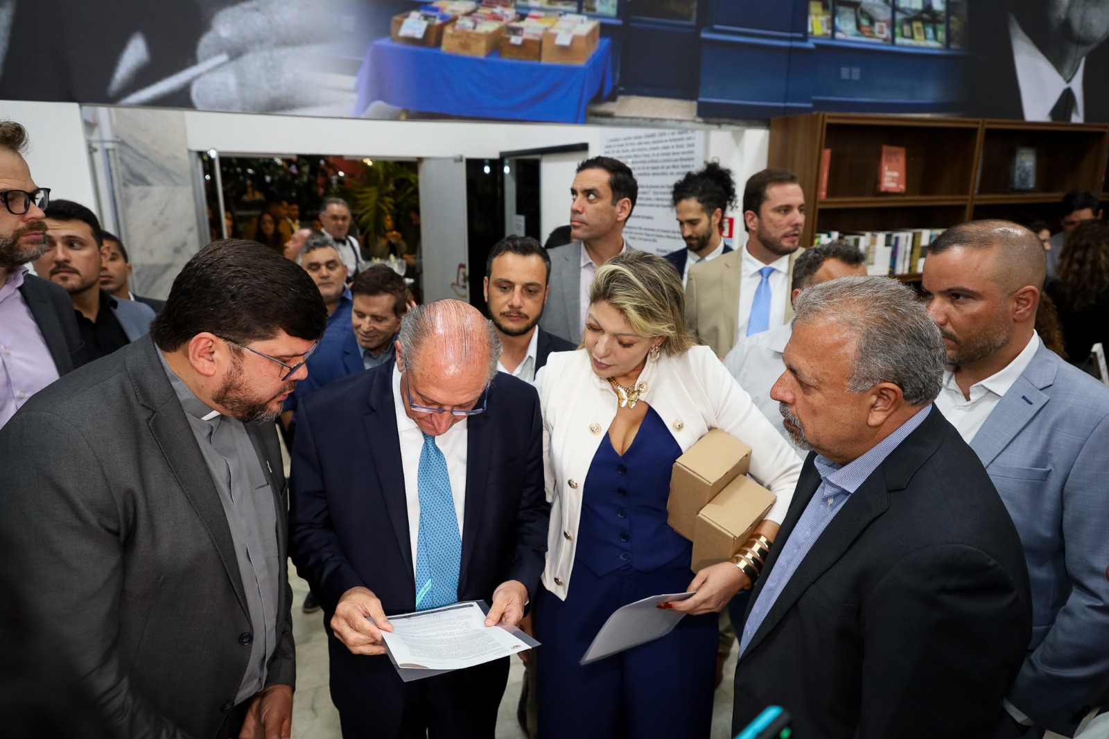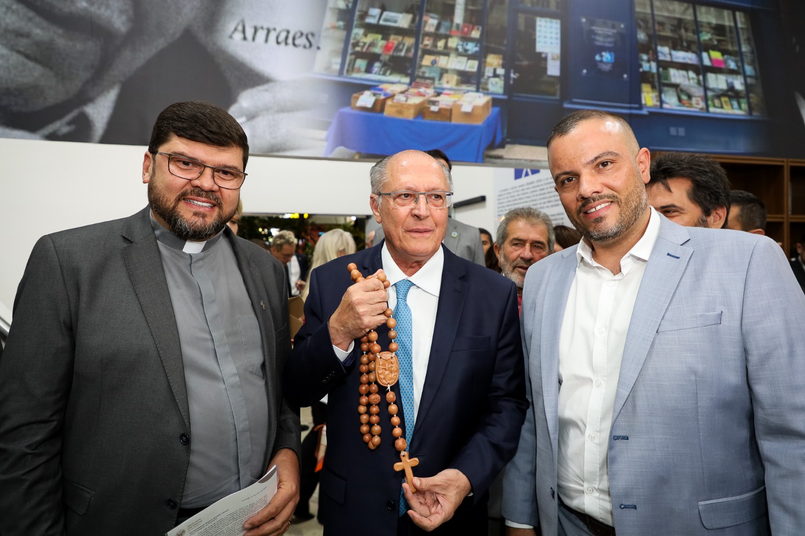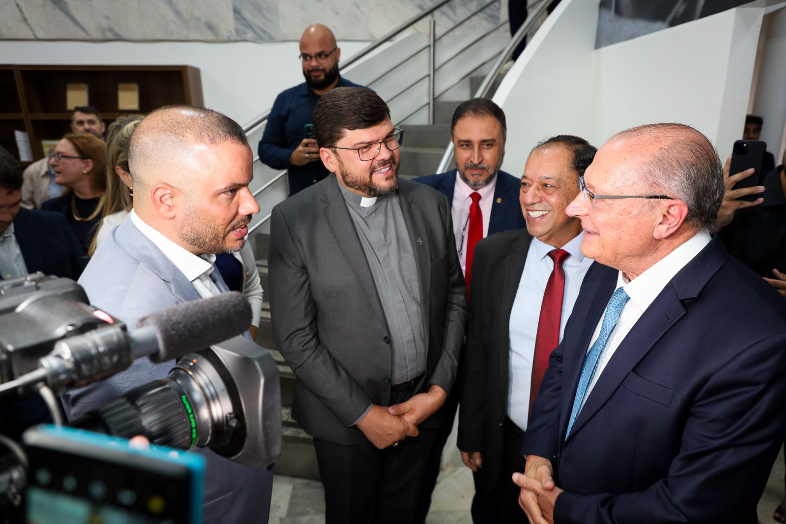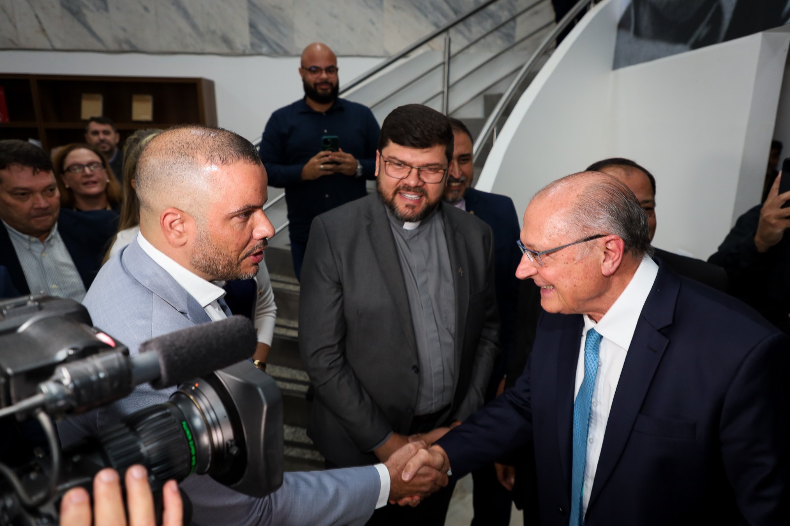 Chefe de gabinete Michel França, Padre Marco Aurélio e secretária Fabiana Machado estenderam convites ao vice-presidente Geraldo Alckmin e outras personalidades para celebrações do Divino Pai Eterno